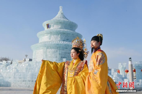 漢服愛好者打卡長春冰雕“祈年殿”