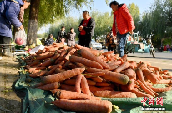 10月16日,吉林長(zhǎng)春,市民在挑選胡蘿卜。當(dāng)下正是中國(guó)東北民眾“囤秋菜”的季節(jié),滿(mǎn)載大蔥、白菜、胡蘿卜等秋菜的貨車(chē)?吭陂L(zhǎng)春市區(qū)指定銷(xiāo)售區(qū)域,市民們穿梭挑選,忙碌地儲(chǔ)備過(guò)冬秋菜。中新社記者 張瑤 攝