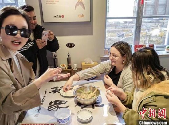 圖為外國留學(xué)生在山東煙臺學(xué)習(xí)包鲅魚水餃!≈行律缬浾 李長亮 攝