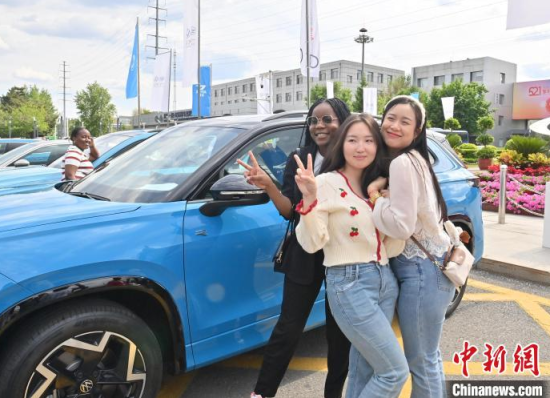 5月23日,吉林長春,留學生在和汽車合影。當天,二十余名留學生走進一汽-大眾長春生產(chǎn)基地,近距離感受中國汽車制造業(yè)的智能化發(fā)展。中新社記者 張瑤 攝