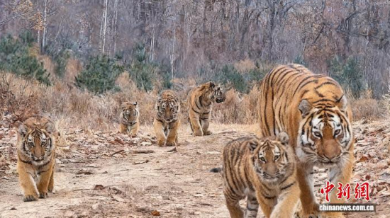 中新社長春12月26日電 (記者 郭佳)記者26日從東北虎豹國家公園管理局獲悉,今年11月8日,在公園的琿春片區(qū)監(jiān)測到一只雌性野生東北虎帶領五只幼崽出現(xiàn),這是中國首次拍到“六虎同框”影像。