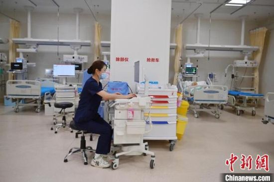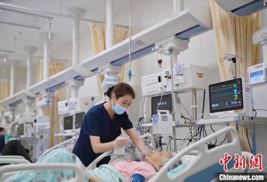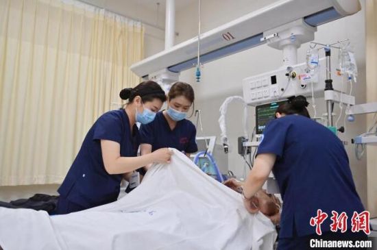 張力(左)對急診監(jiān)護區(qū)每位患者的情況都爛熟于心。護士們與患者朝夕相處,細心照護,關系已經(jīng)超出了普通的醫(yī)患關系。張力說:“他們的親屬不能在身邊陪伴,但是我們每天可以和他們在一起,我們和這些患者的關系像親人一樣! 張瑤 攝