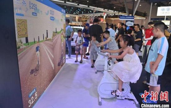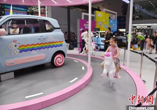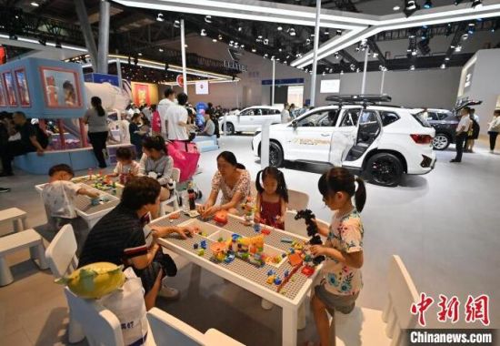 7月13日,在第21屆長春國際汽車博覽會上,小朋友在淘氣堡玩耍。本屆長春汽博會有全球124個品牌的展車亮相,現(xiàn)場設(shè)置了許多游戲體驗項目,吸引小朋友們參與。 (中新社記者 張瑤/攝)