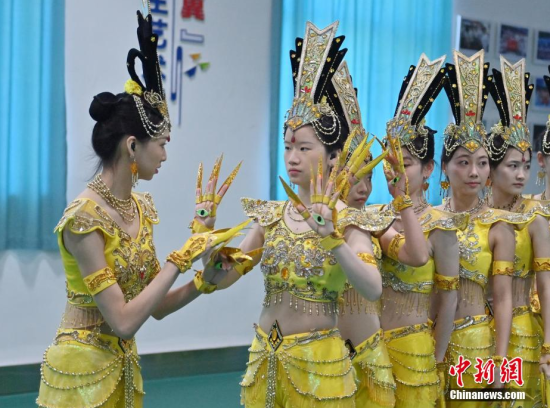4月22日,在長(zhǎng)春大學(xué)特殊教育學(xué)院,學(xué)生們?cè)谂啪殹肚钟^音》。這所學(xué)院擁有一支由29名聽障學(xué)生組成的舞蹈團(tuán)隊(duì)。他們因?qū)ξ璧傅臒釔鄱奂谝黄穑跓o聲的世界中舞出他們精彩的人生篇章。中新社記者 張瑤/攝