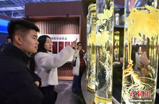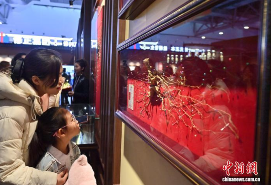 12月7日,吉林長春,參觀者在參觀人參。當(dāng)日,2025長春國際醫(yī)藥健康產(chǎn)業(yè)博覽會開幕,具有當(dāng)?shù)靥厣那暌吧絽、人參?biāo)本在人參展區(qū)展出,吸引了參觀者的目光。中新社記者 張瑤 攝