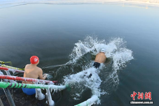 2026年1月1日,在長(zhǎng)春南湖公園,冬泳愛(ài)好者在湖水中暢游。當(dāng)天,近百名冬泳愛(ài)好者齊聚南湖,以冬泳的方式迎接新年。中新社記者 張瑤 攝