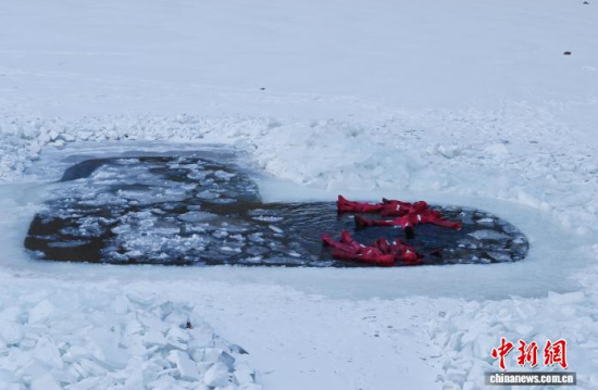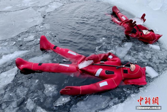 2月5日,吉林省長(zhǎng)春市,一項(xiàng)獨(dú)特的冰浮項(xiàng)目吸引眾多游客前來(lái)體驗(yàn)。在嚴(yán)寒天氣中,參與者身穿醒目的紅色浮力裝備,悠然漂浮于冰面之上,感受別致的冰雪樂(lè)趣。圖為游客在下水前拍照留念。中新社記者 張瑤 攝