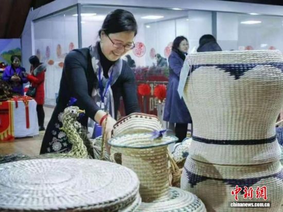 圖為曲秀杰攜草編作品參加展會(huì)。曲秀杰供圖